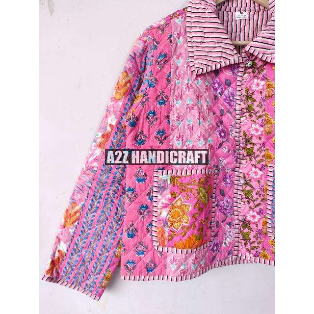 New pink Patchwork Jacket, Cotton Quilted Handmade Cotton Patchwork Jacket Reversible Strip Quilted Cotton Jacket .
