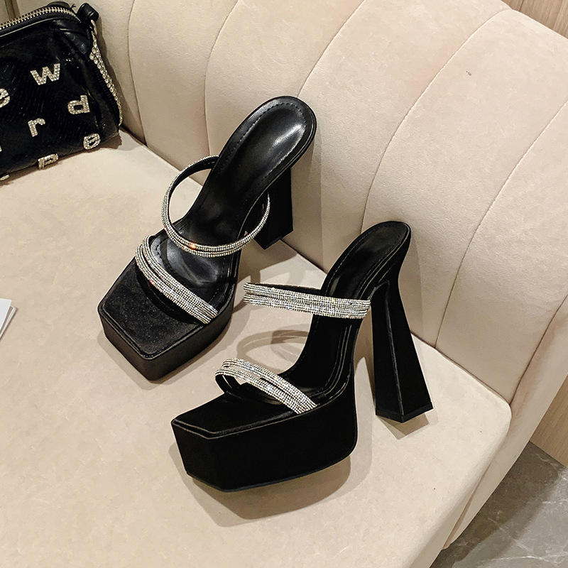 New style women's shoes - waterproof platform thick high-heeled square toe crystal slip-on sandals with crystal straps