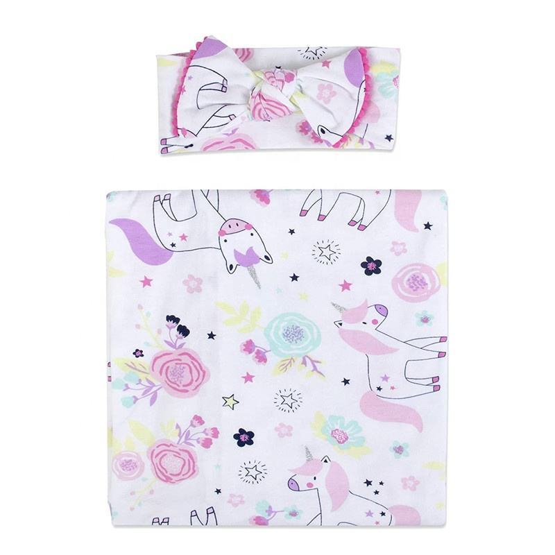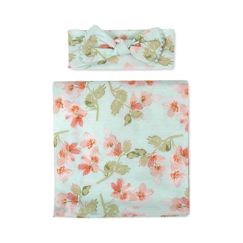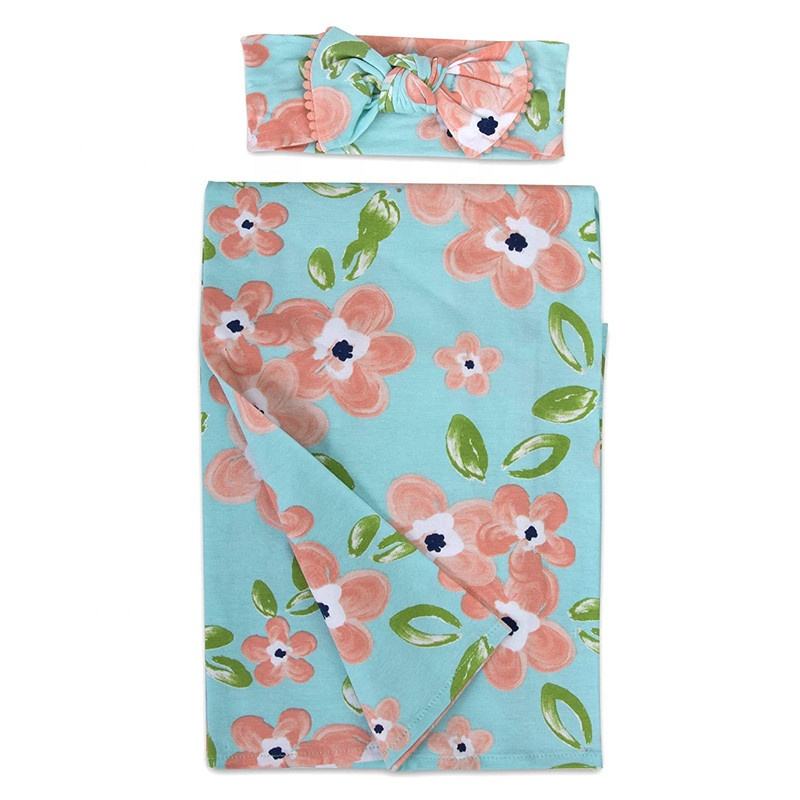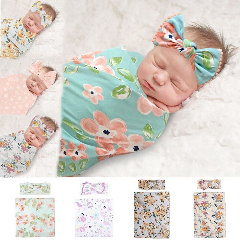 Newborn Baby Swaddle Blanket with Knotted Headband Set Baby Shower Floral Swaddling Wrap Newborn Sleeping Bag