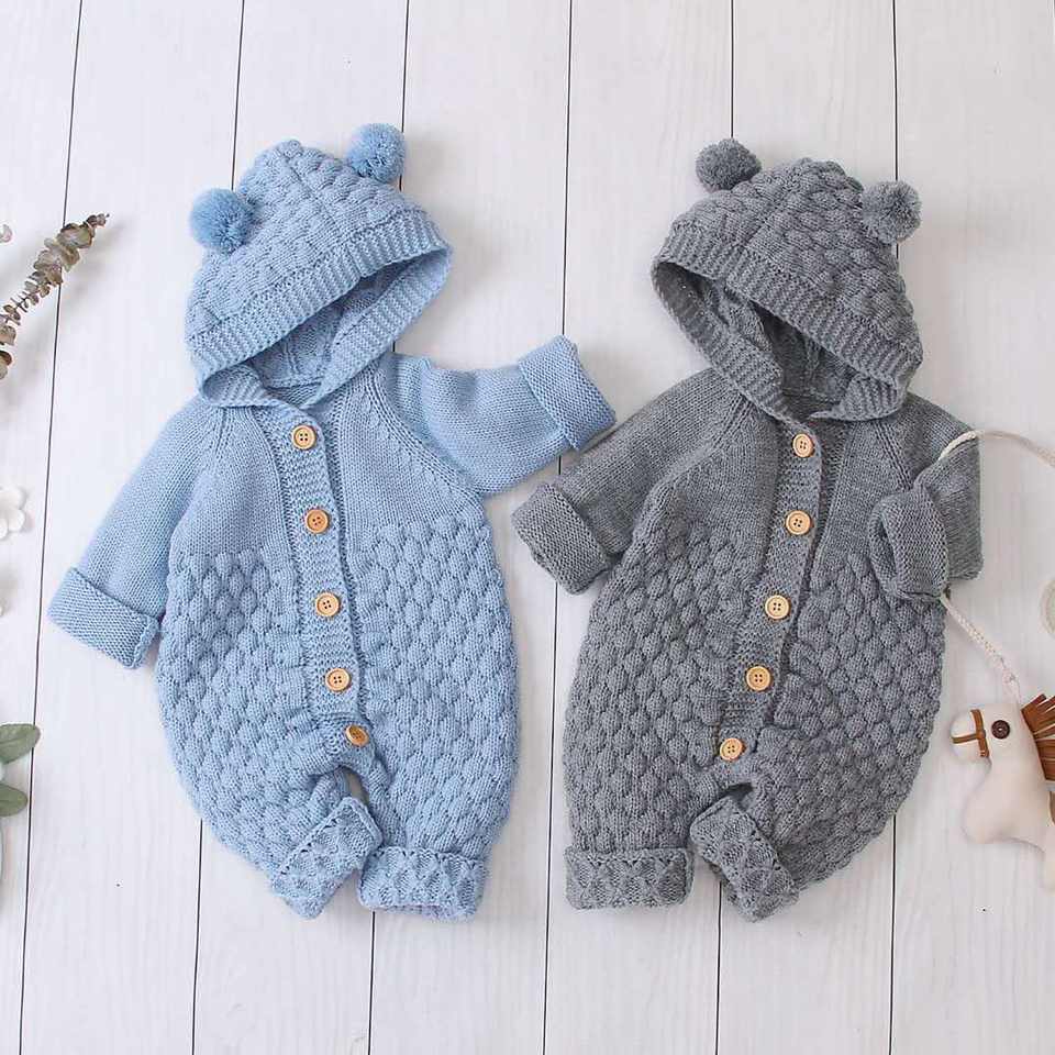 Newborn Infant Knit Onesie Toddler Long Sleeve Sweater Jumpsuit Cartoon Bear Winter Clothes Hot Sale Hooded Baby Romper