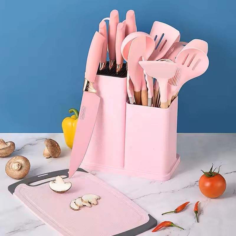 Newest 19 Pcs Silicone Kitchen Utensil Set With Wooden Handle Cooking Tools Cuttings Board Storage Bucket Kitchen Gadget Set