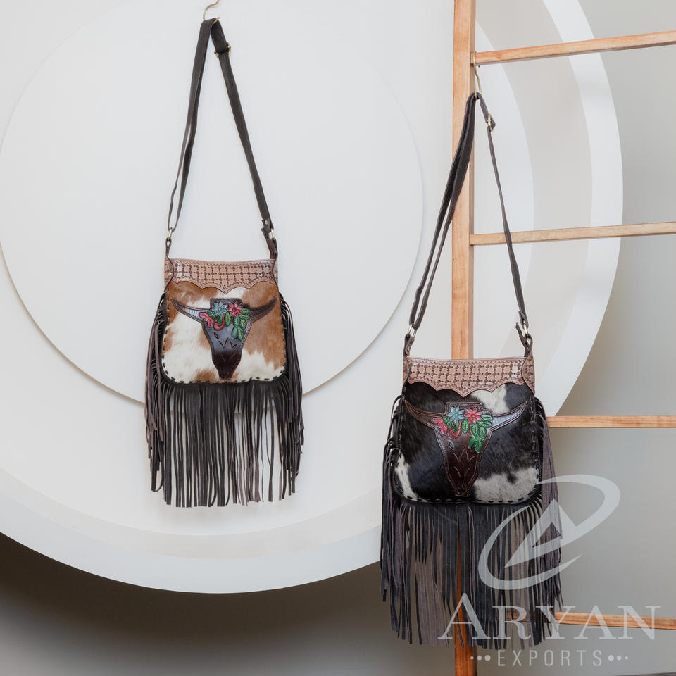 Newest Branded Handmade Hair on Tooled Leather Crossbody Purse Western Bull Skull Cowgirl Style Genuine Cowhide Leather Purse