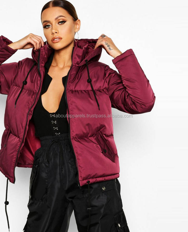 Newest Fashionable Custom Long Sleeve Winter Women's Quilted Padded Coat Pearls Stripe Burgundy Hooded Zipper Closure Waterproof