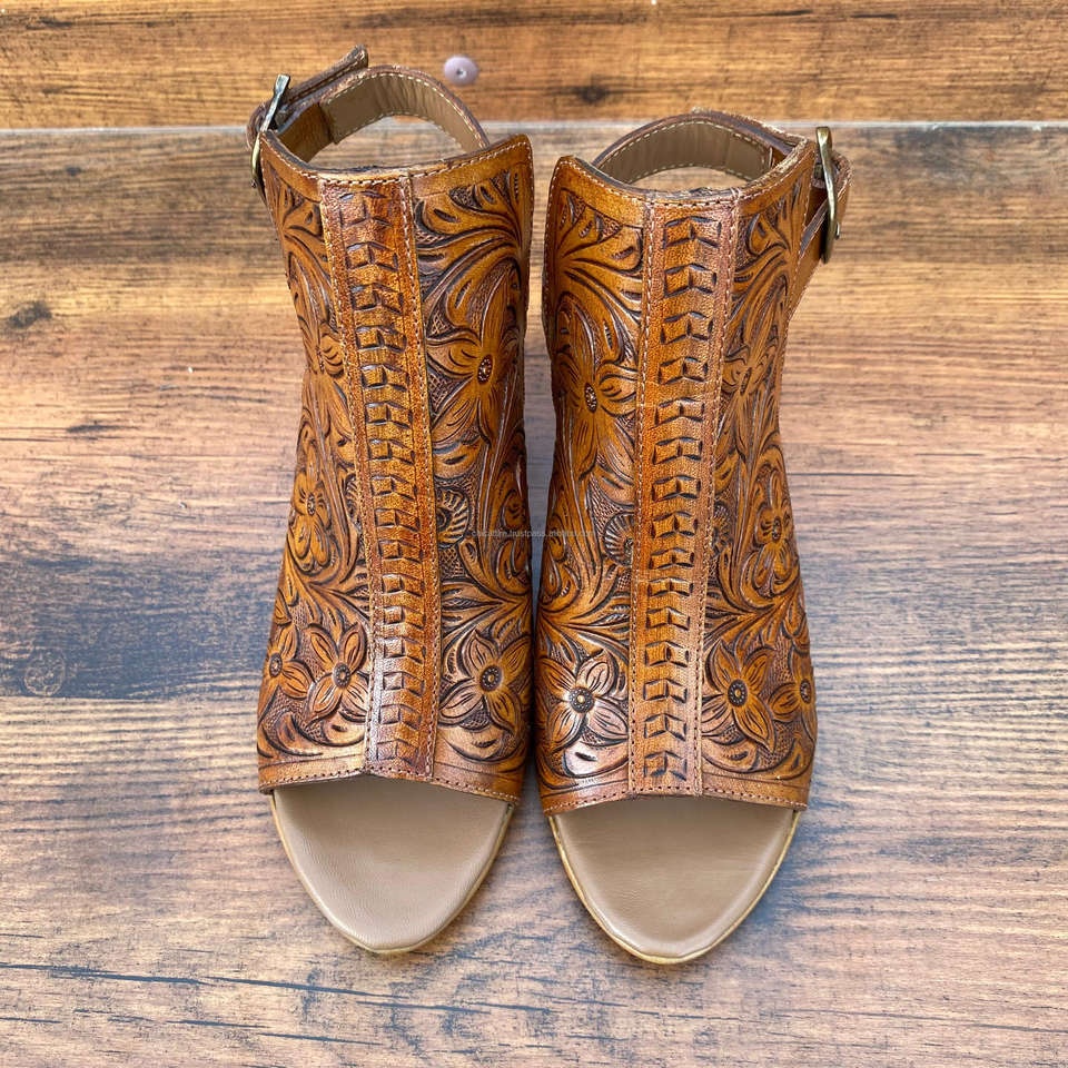 Newest Hand Tooled Leather Heels Sandals Dress Shoes High Heels Western Fashion Women Genuine Leather Wedges Wedding Prom Shoes