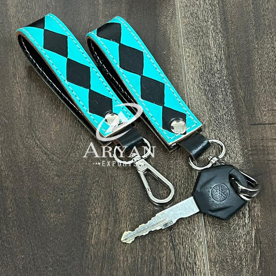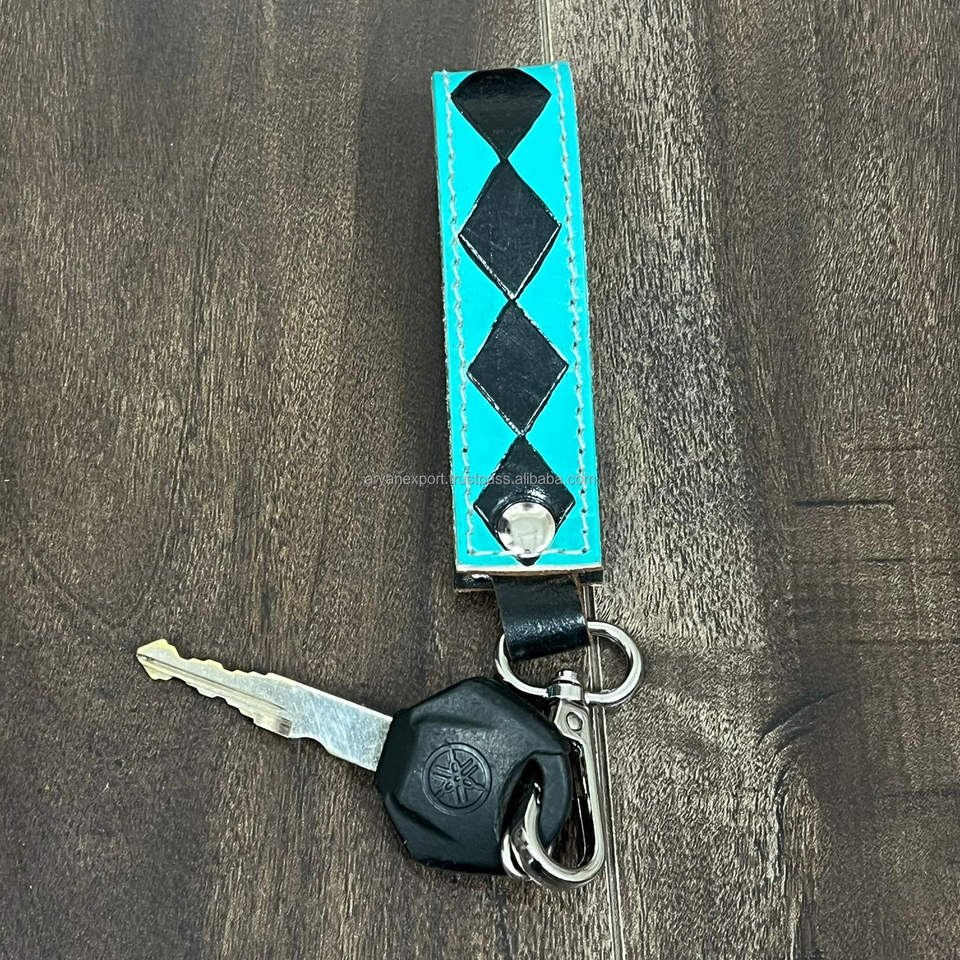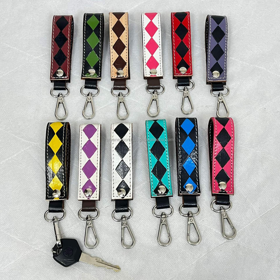 Newest Keychain Genuine Checkered Leather Wristlet Bohemian Wrist Strap Car Keyring Engraved Cowhide Leather Wristlet Key Clip