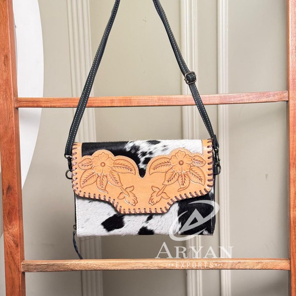 Newest Sunflower Hand Tooled Leather Hair-On Cowhide Leather Crossbody Carryall Wallet Genuine Leather Women's Organizer Wallets