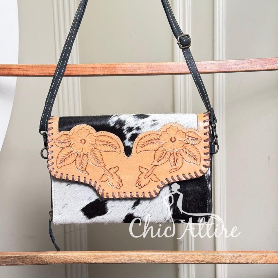 Newest Sunflower Hand Tooled Leather Hair-On Cowhide Leather Crossbody Carryall Wallet Genuine Leather Women's Organizer Wallets