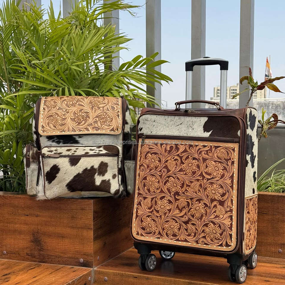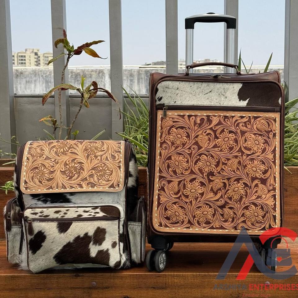 Newest Trending Customizable Hand Tooled Cowhide Leather Wheel Trolley Suitcase & Hand Tooled Leather Diaper Backpack Combo Sets