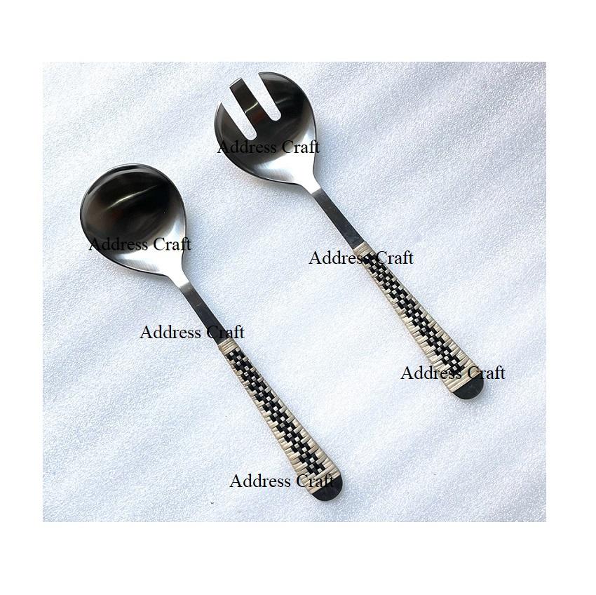 High Quality Silver Matt Polished Salad Server With Wicker Handle Best Selling Stainless Steel Salad Tools Elegant Salad Spoon