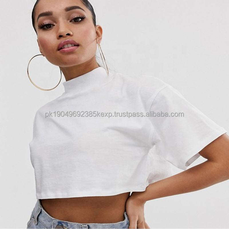 Newly Fashion 100% Cotton Plain White Haut Crop Top Femme Turtle Neck Dropped Shoulders Women Crop Top