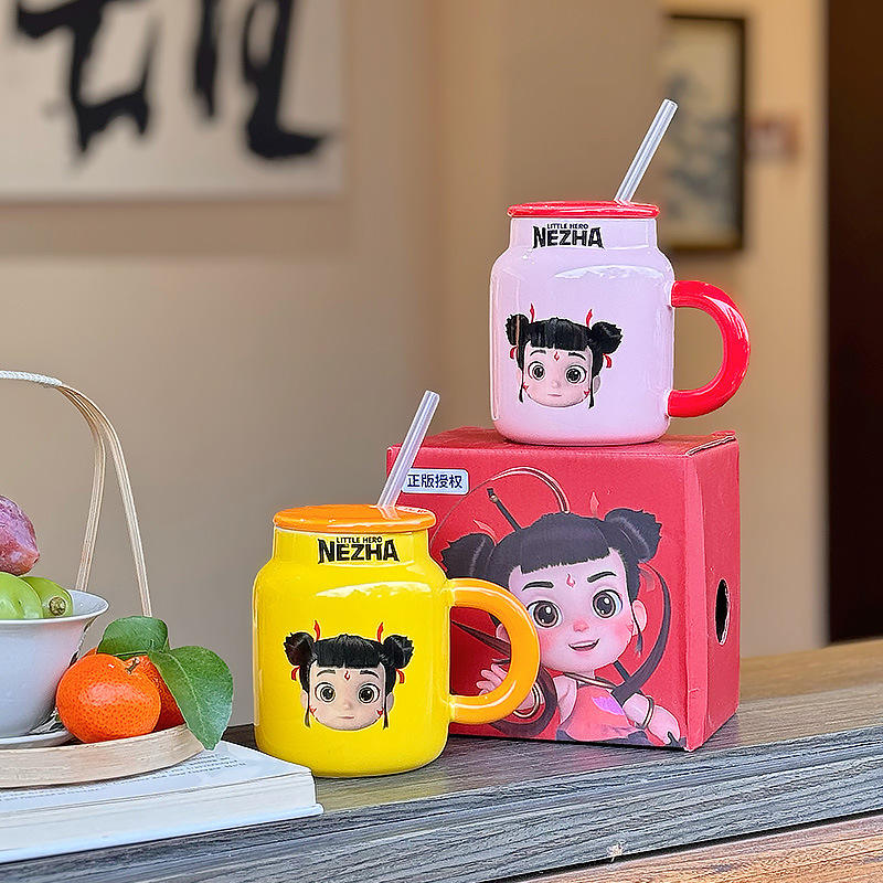 Nezha Ceramic Mug With Lid And Straw Cartoon Design For Girls Birthday Gift Home Office Use
