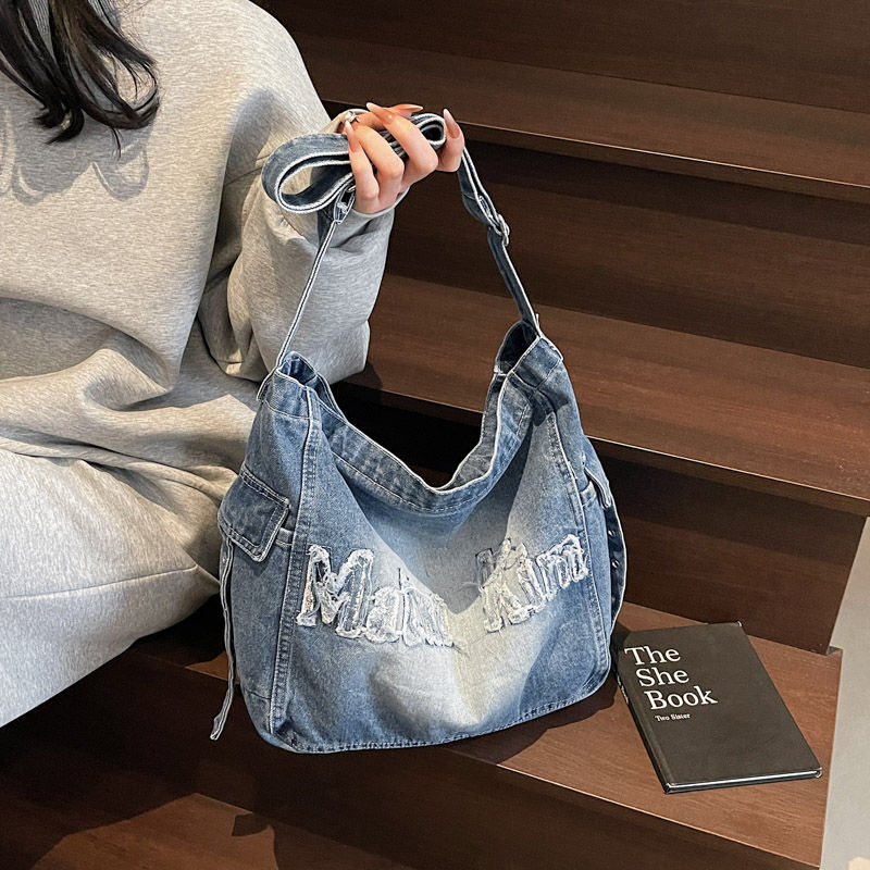Niche Raw-Trim Denim Tote Bag Original Letter Embroidery Design for Women New Early Autumn Collection Shoulder Bag Wholesale