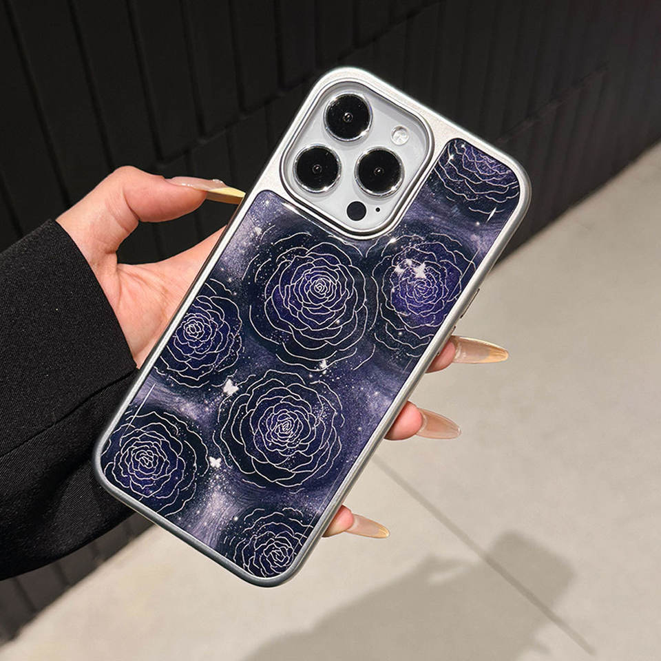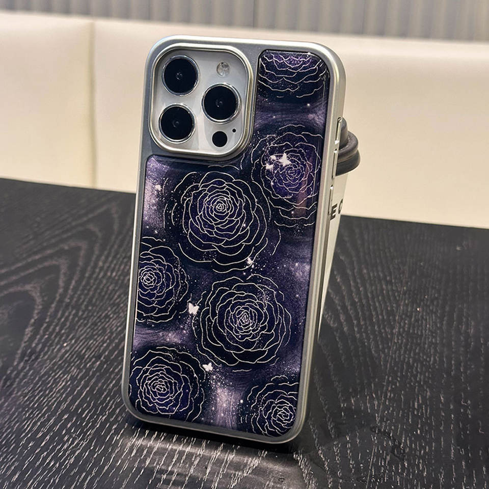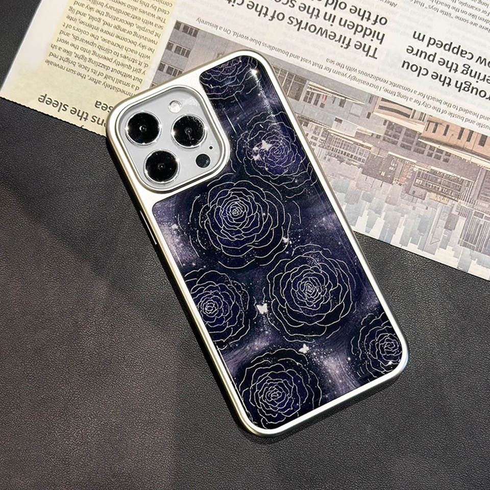 Night Rose Silver-Edged Resin Case for iPhone 17, Shockproof Phone Case, Protective Cover for iPhone 16 Pro Max and 15