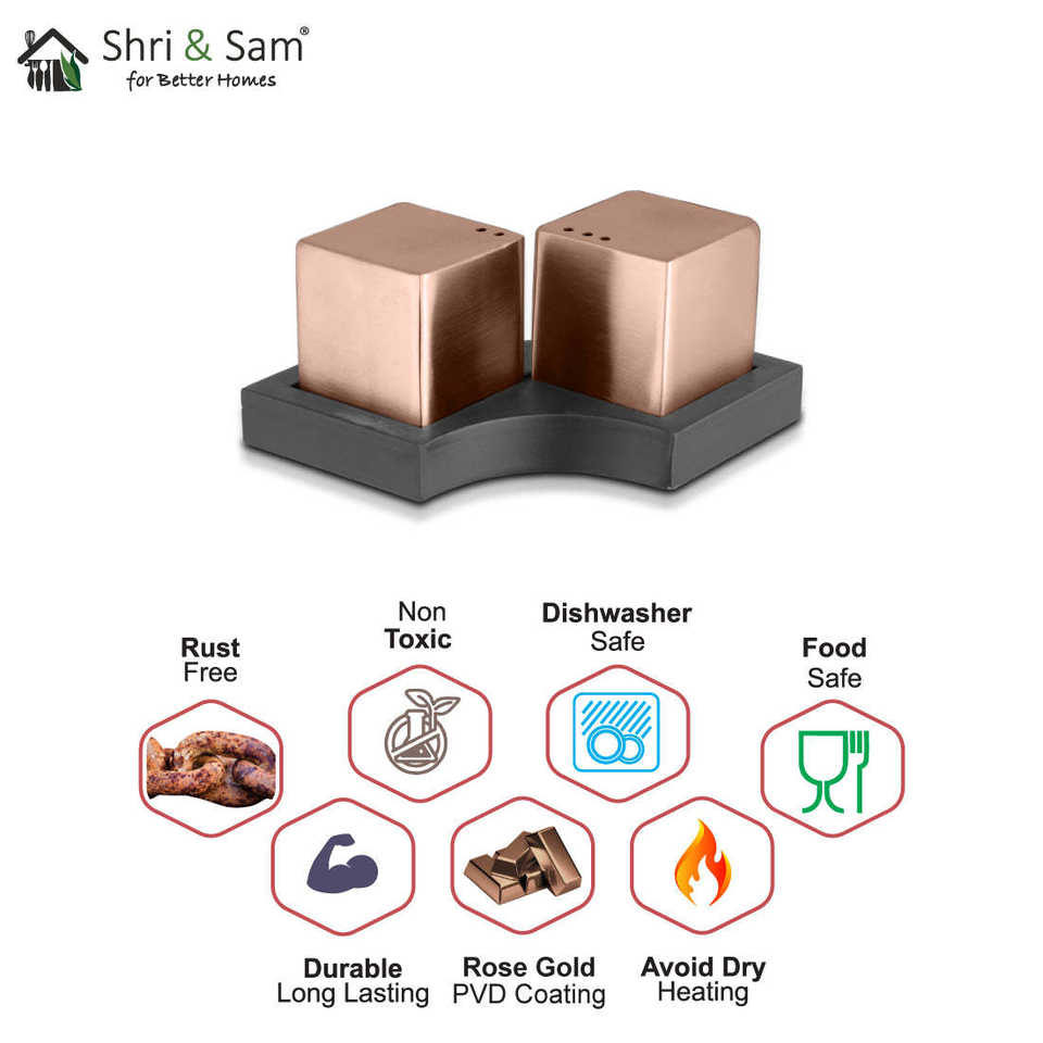 Nikki Stainless Steel Dice Salt & Pepper Shakers with Rose Gold PVD Coating Cocktail Shakers