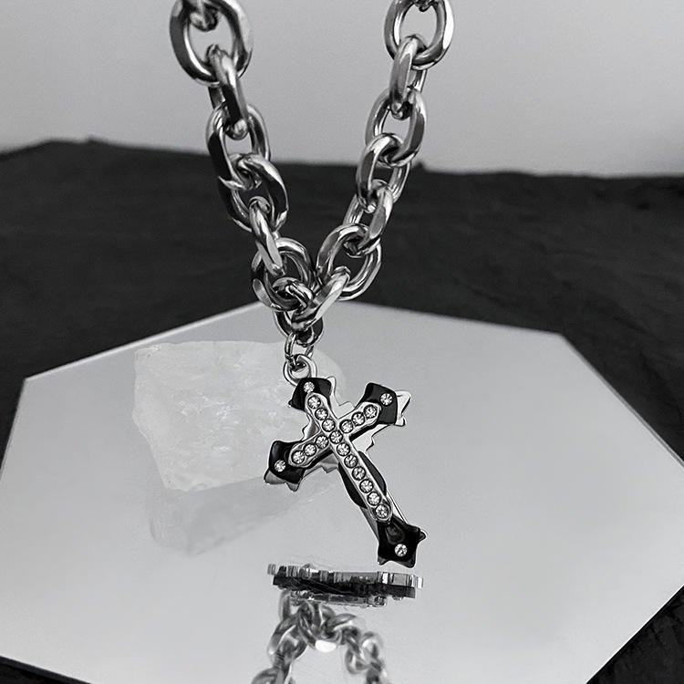 No Fade Men's Jewelry Sier Color Stainless Steel Cuban Chain Dia Cross Pendant Necklace for Men