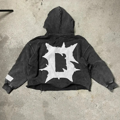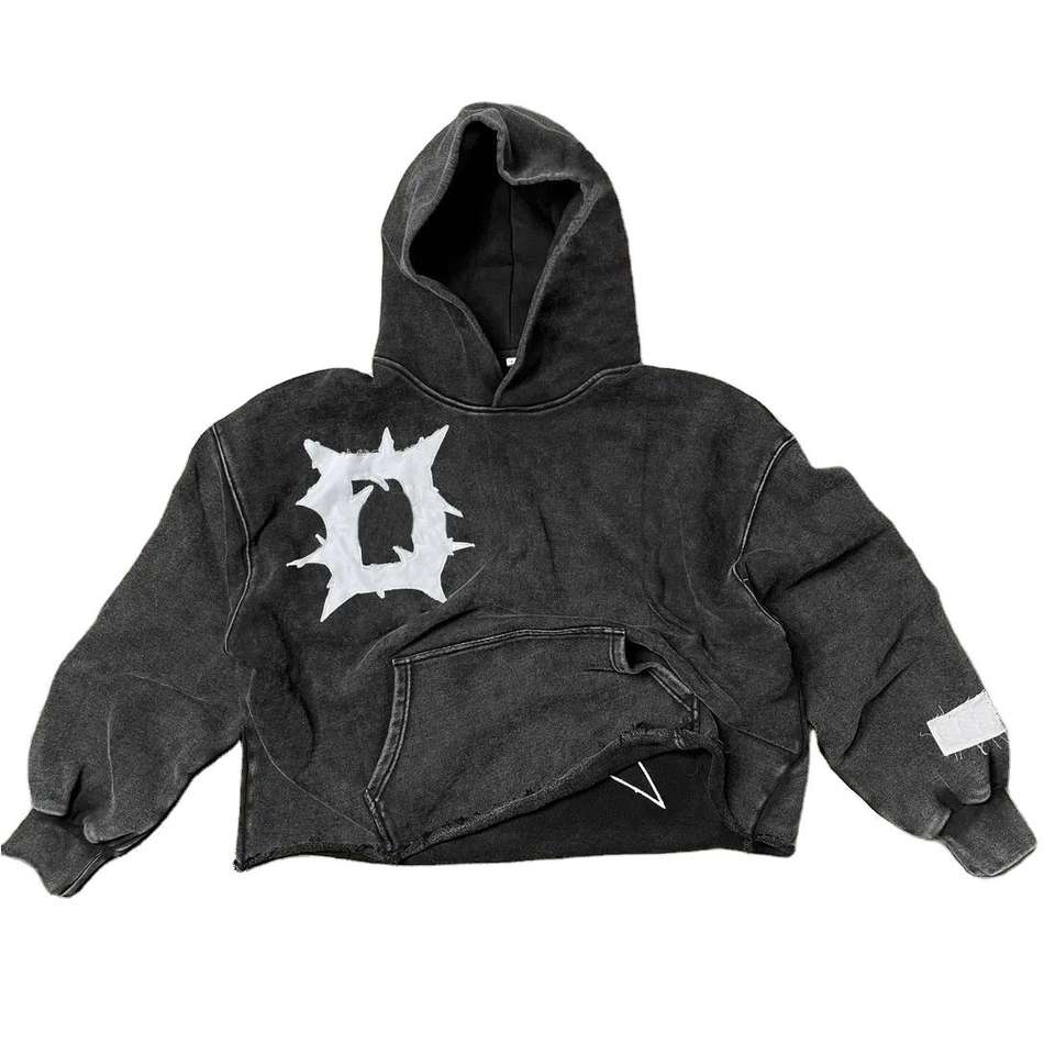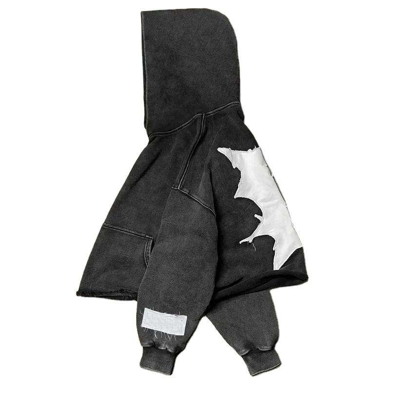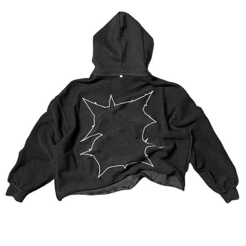 Custom Acid Wash Cropped Hoodies for Men No Pocket Sun Faded Cut Edge Raw Hem Applique Distressed Patch Embroidery Men's Sets