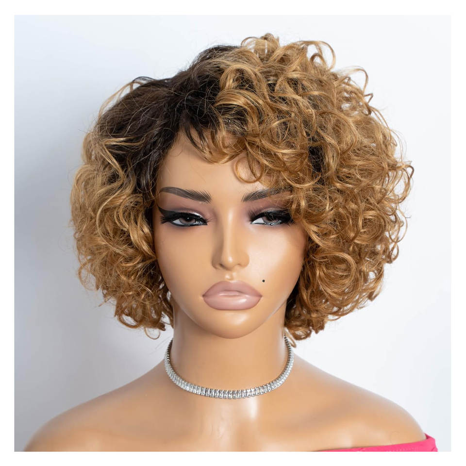 Non Lace Glueless Short Curly Bob Wig Women Brazilian Remy Hair with Side Part Ombre Dark Brown to Honey Blonde