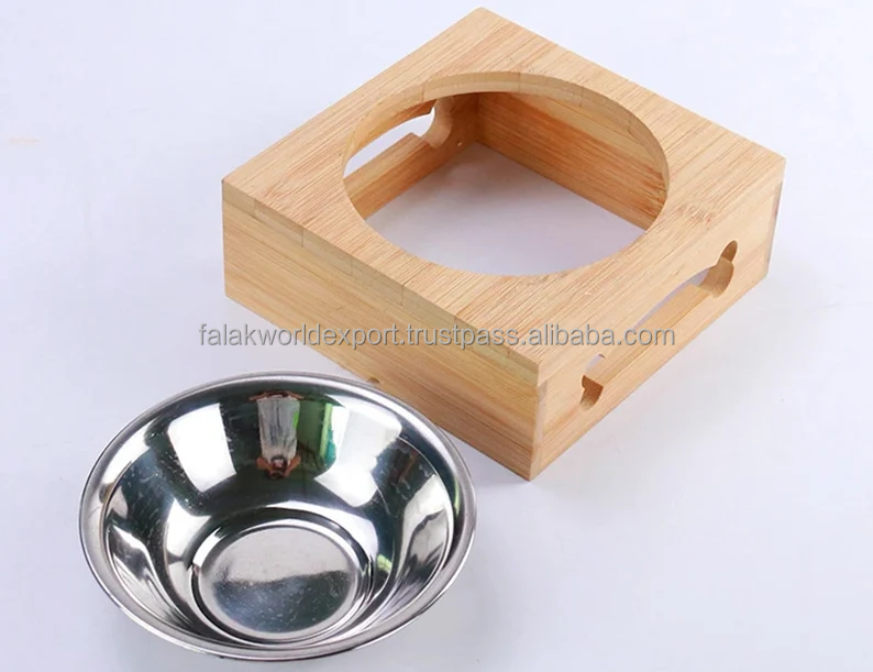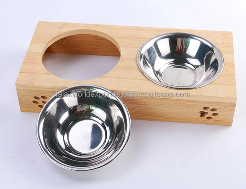 Wood Raised Dog Bowl Stand With Stainless Steel Bowls, Non-Slip Dogs Cats Feeding Dishes, Elevated Dog Bowls By FWE