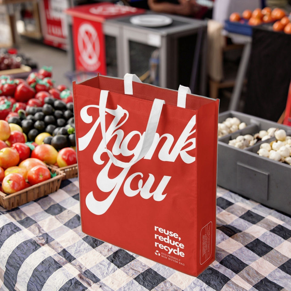 Non-woven tote bags, eco-friendly, reusable, with custom logo printing, customizable sizes, suitable for supermarket shopping