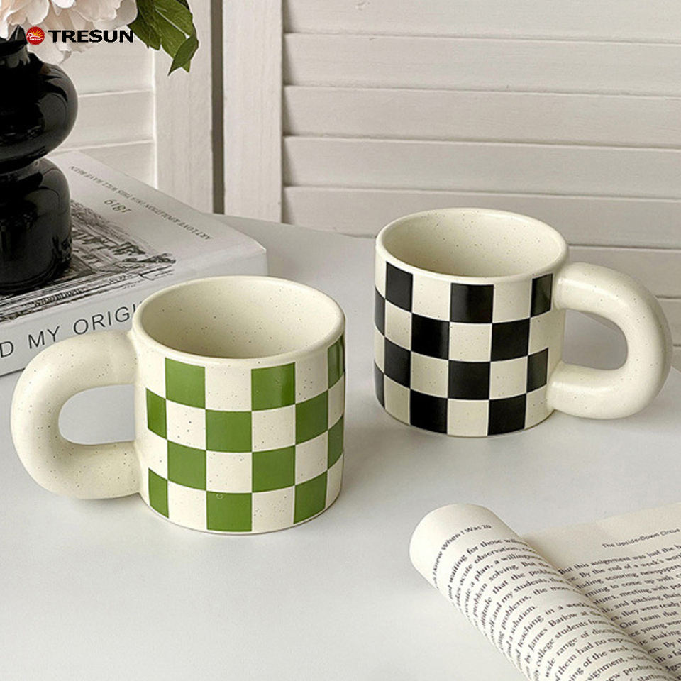 Nordic Creative Checkerboard Mug Black and White Checkered Ceramic Mug Unique Fat Big Handle Coffee Mugs As Christmas Gift