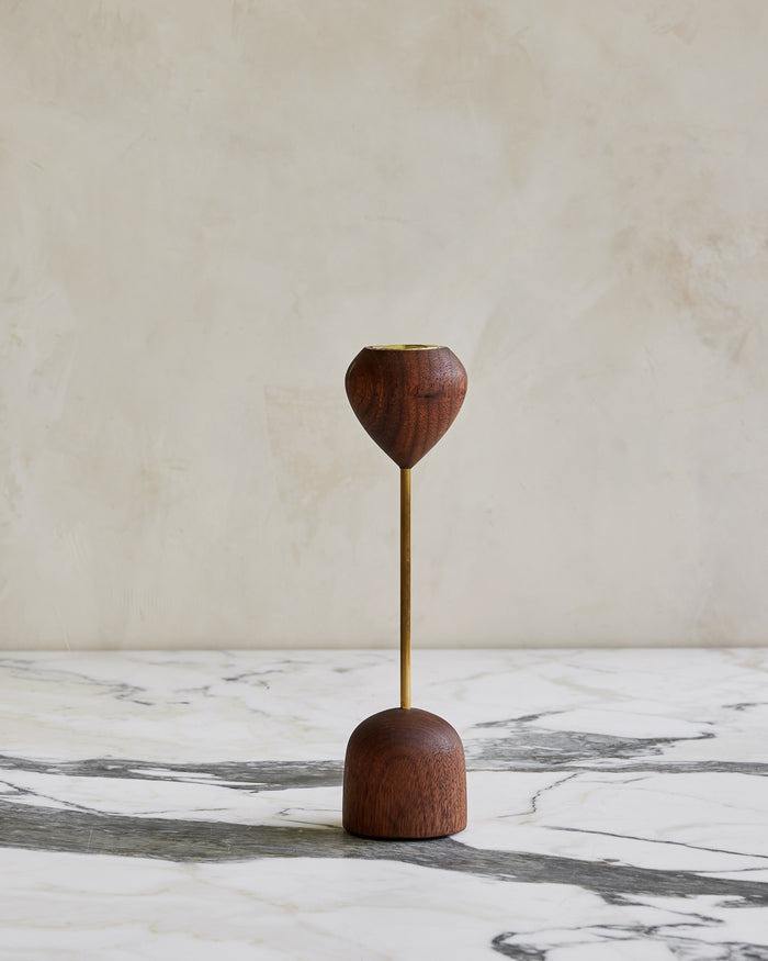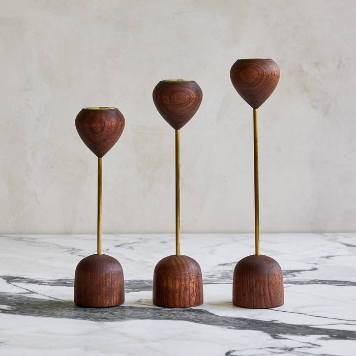 Nordic Style Natural Wood Candle Holder Set with Gold Metal Stem Heart Shape Wooden Taper Stand for Minimalist Wedding Decor