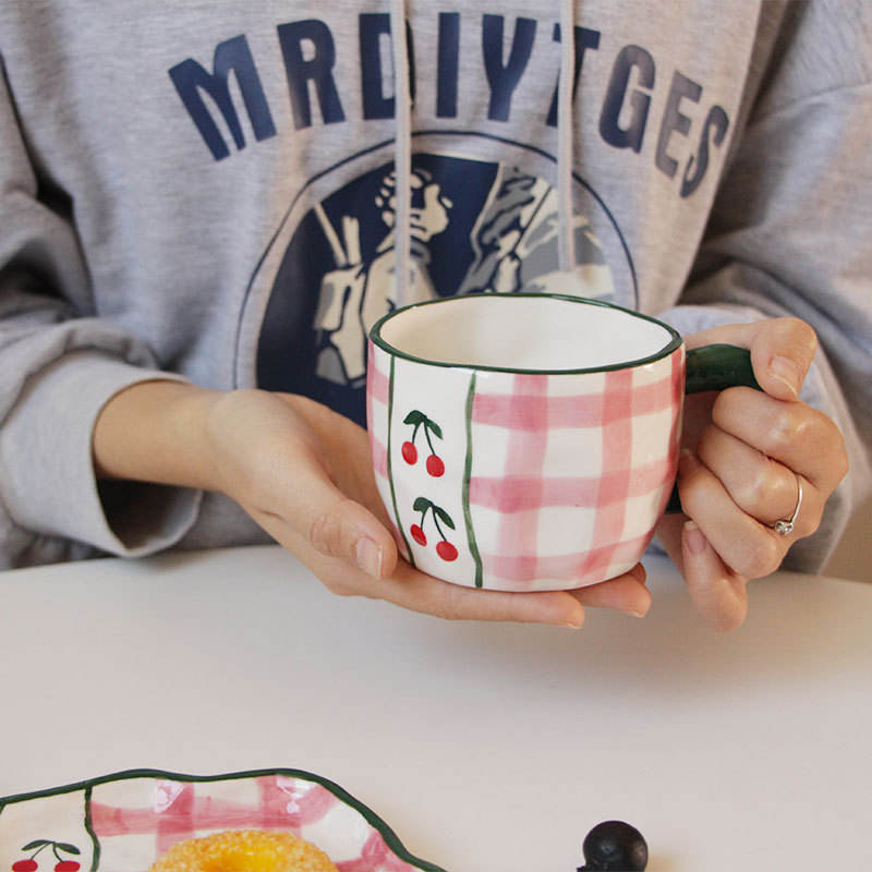 Nordic Tableware pink Cherry Coffee Mug Hand Pinch Plate Cute Ins Wind Ceramic Mug