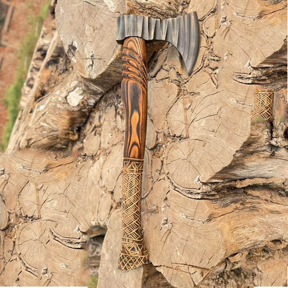 Nordic Viking Axe Industrial Grade with Engraved Pattern Head Leather Wrapped Grip and Rustic Wooden Handle