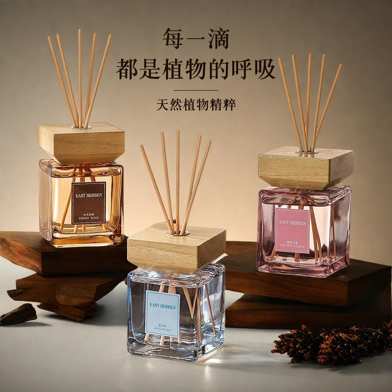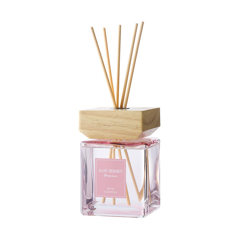 [Premium-quality wooden-capped square bottle with reed diffuser]