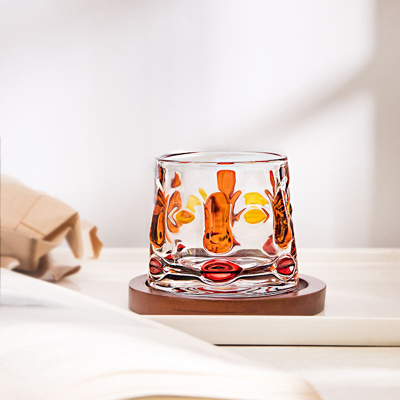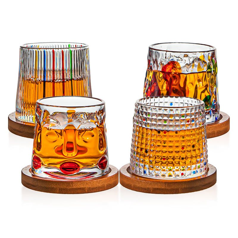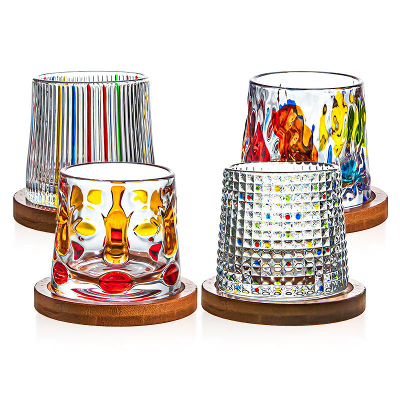Novelty Hand-painted Stress Relief Cups Colored Embossed Rotating Whiskey Tumbler Glasses With Wooden Base