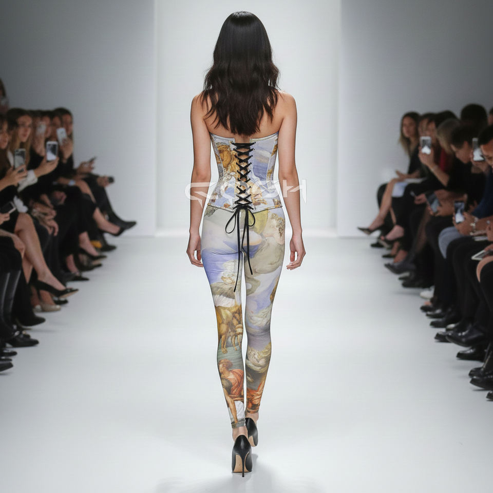 Nude Renaissance Artwork Satin Printed Strapless Overbust Steel Boned Breathable Fashion Corset Stretchable Legging Waist