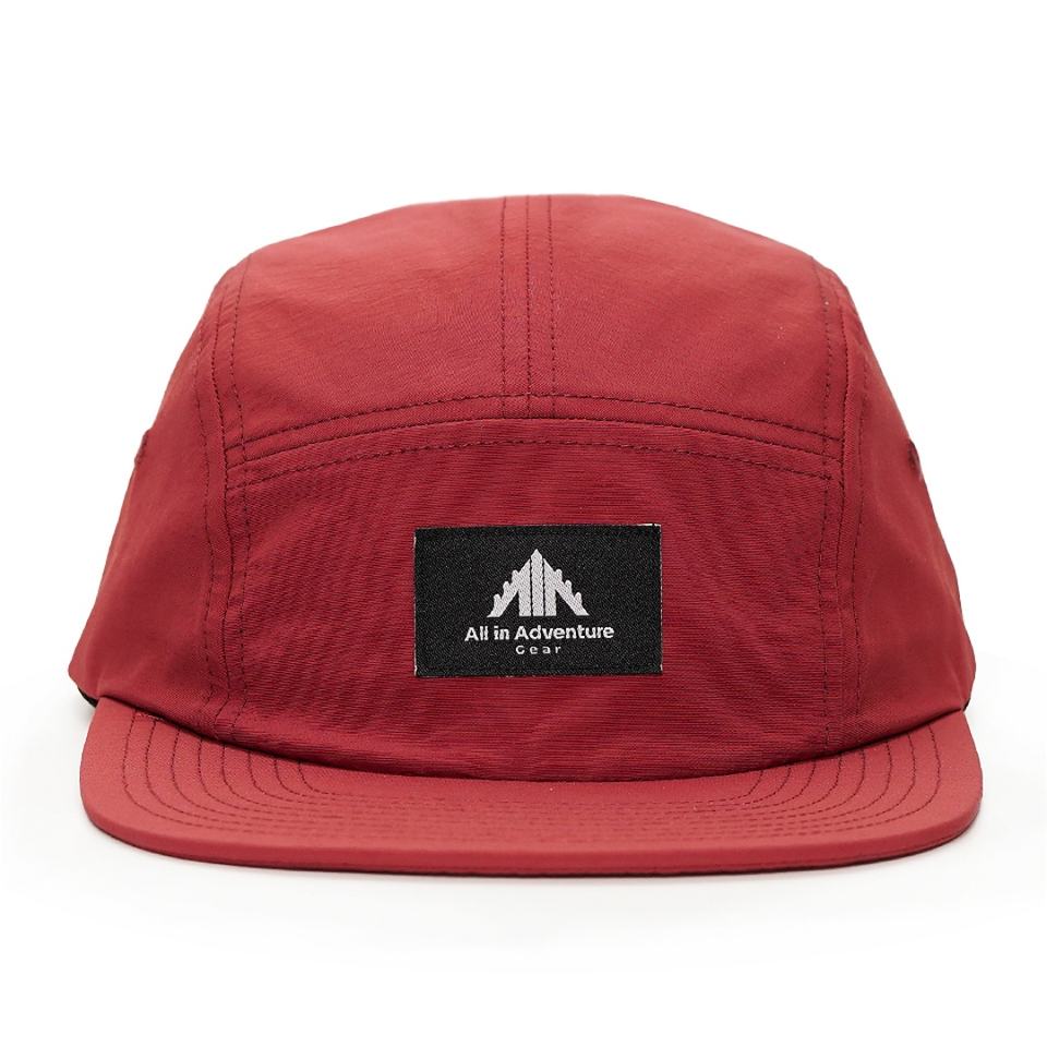 Nylon 5 Panel Camp Cap Custom Unstructured Woven Label Applique Red Hats