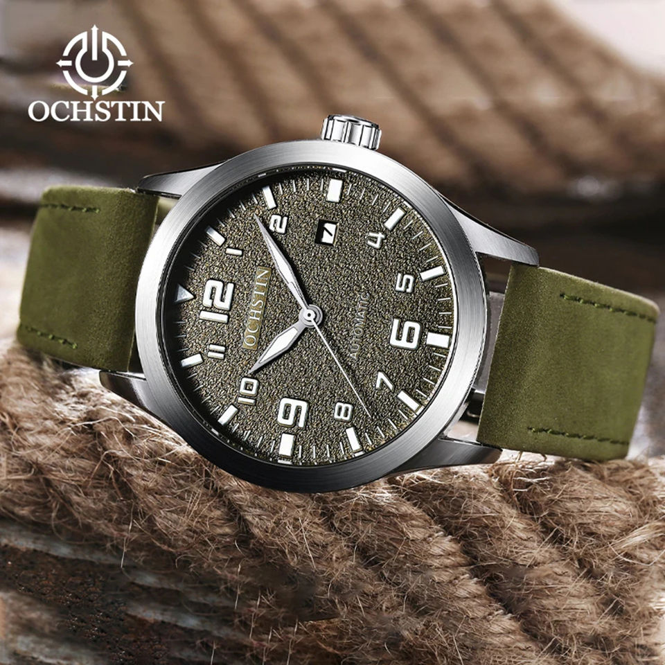 OCHSTIN Men Mechanical Sport Fashion Business Wristwatch 40mm Pointer Stainless Steel PU Leather Band Water Resistant Auto Date