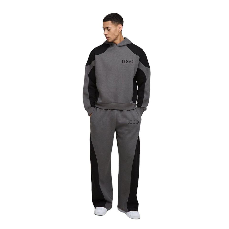 OEM Black Oversized Color Block Unisex Hooded Tracksuit Breathable Heavyweight 500GSM Panel Detail Wide Legg Joggers Crop Hoodie