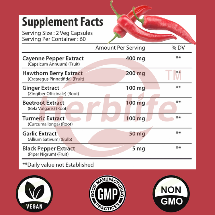 Main Ingredient:Cayenne Pepper with Garlic, Ginger, Hawthorn, Turmeric, Beet Root and Black Pepper Extract