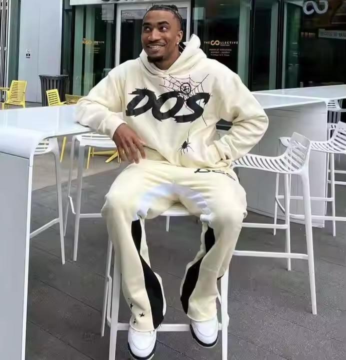 OEM Cotton Print Cut Raw Hem Edge Hoodie Patchwork Pant Men Tracksuits Heavyweight Stacked Flared Mens Two Pieces Jogger Sets