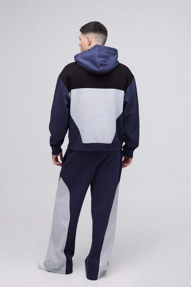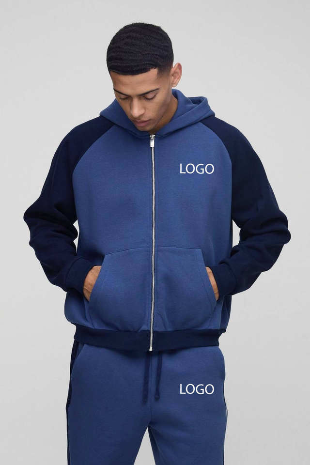OEM Custom 2-Piece Men's Sporty Jogger Set Navy Oversize Hoodie Raglan Color Block Zipper Hoodie & Wide Leg Sweatpants Tracksuit