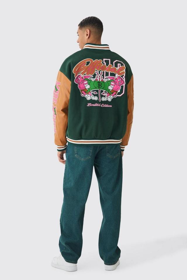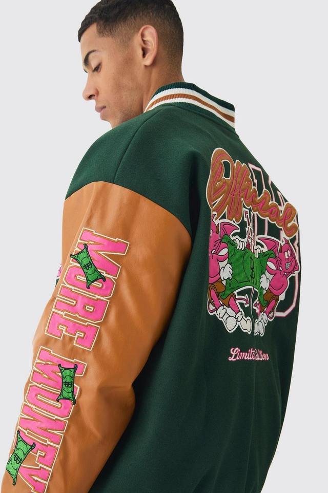 OEM Custom Clothing Manufacturer Green Color Oversized Fit Embroidery Chenille Varsity Jacket Men's Brown Leather Sleeve Jacket