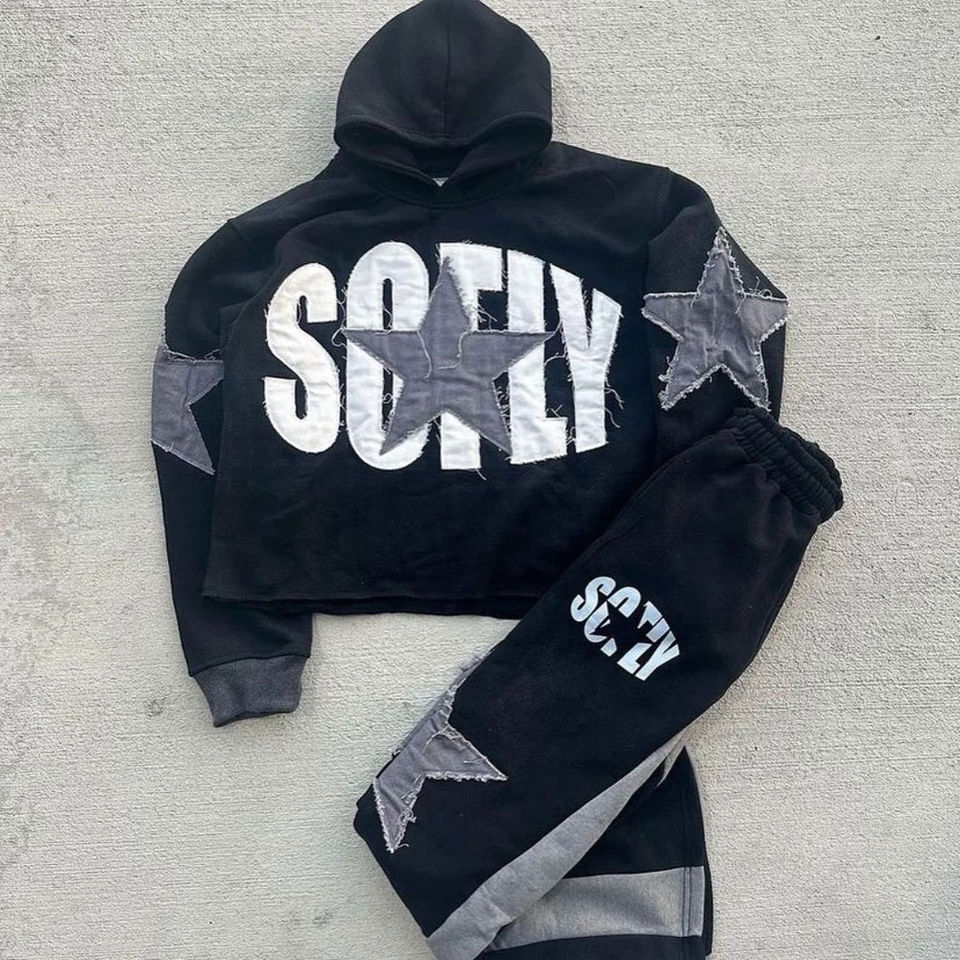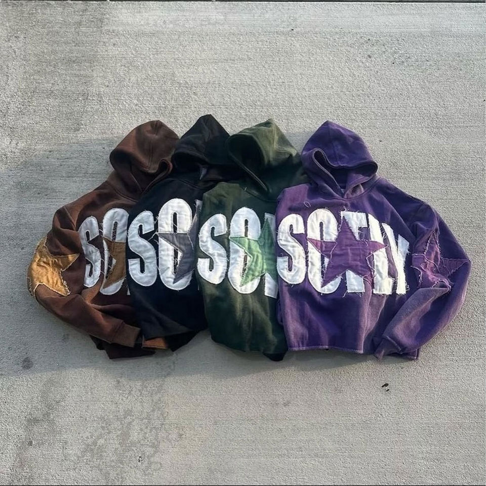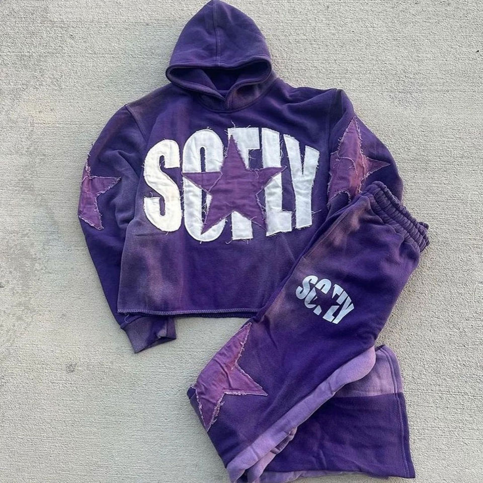 OEM Custom Distressed Patch Embroidery Logo Acid Wash Vintage Pullover Hoodie Flared Sweats Heavyweight Tracksuit For Men