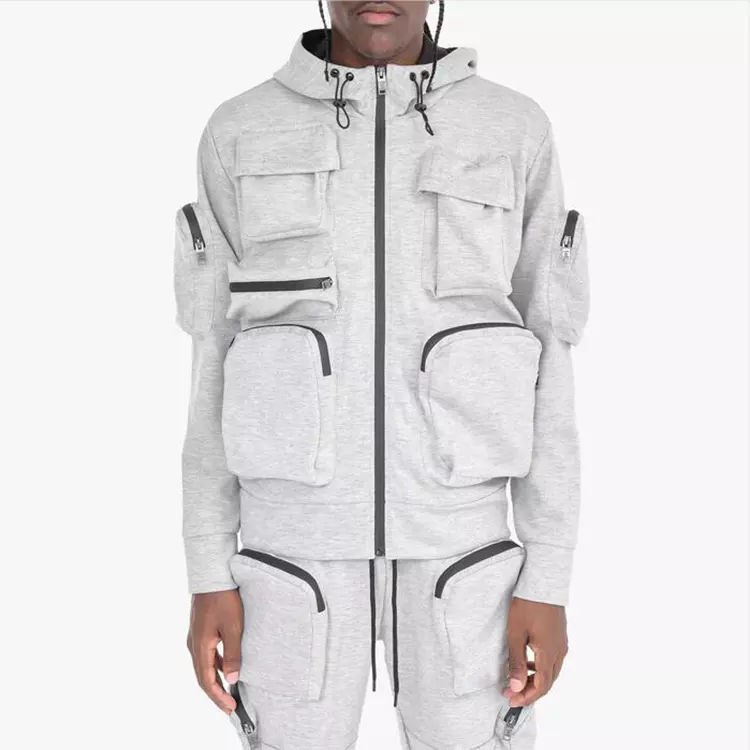 OEM Custom Heavy Thick Cotton Fleece Multi Cargo Pockets Full Zip up Men's Hoodies New Fashion solid color Men Hoodie
