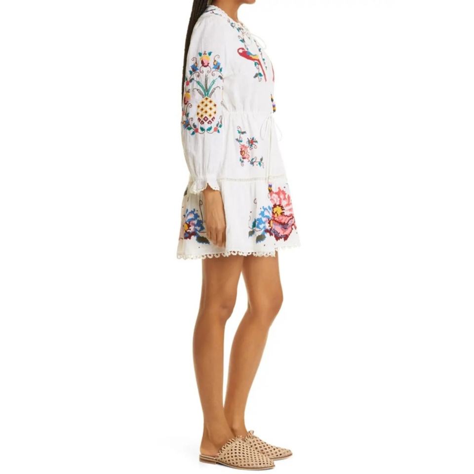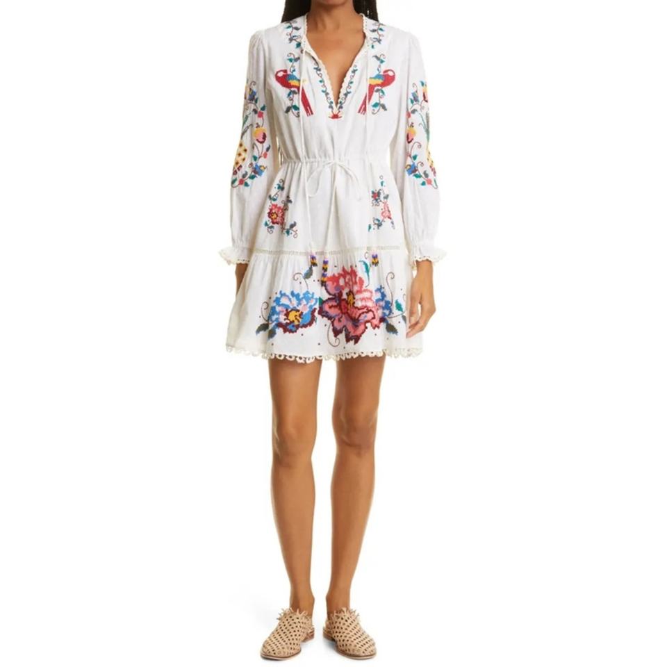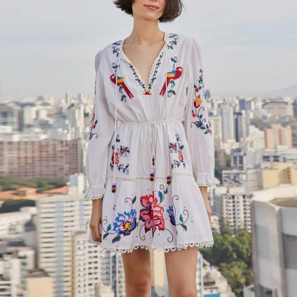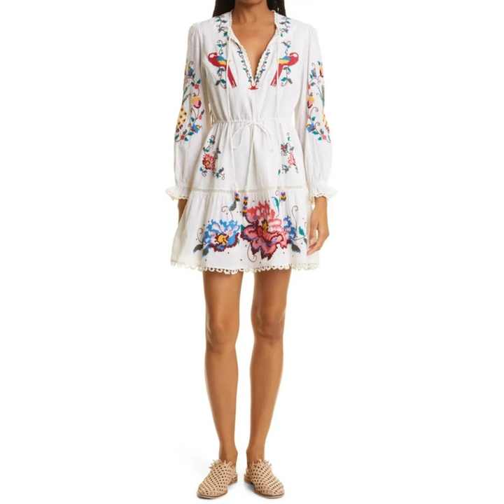 OEM Custom High Quality Ladies Elegant Linen Summer Dress Floral Natural Long Sleeve Fashion Casual Stitch Embroidery Design