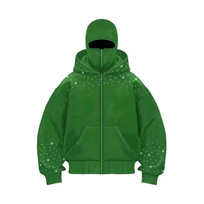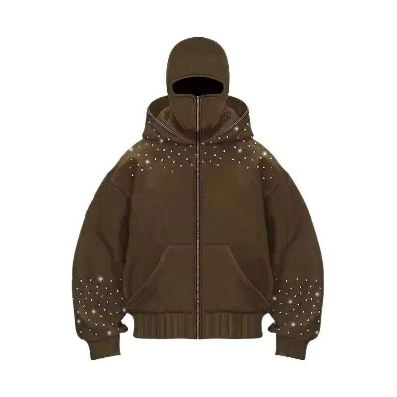 OEM Custom Logo Men Face Mask Full Zip up Balaclava Hoodies Ski Masked Fleece Cotton Ninja Rhinestone Heavy Street Sweatshirt