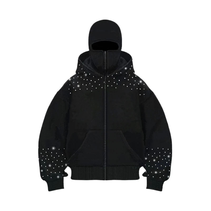 OEM Custom Logo Men Face Mask Full Zip up Balaclava Hoodies Ski Masked Fleece Cotton Ninja Rhinestone Heavy Street Sweatshirt