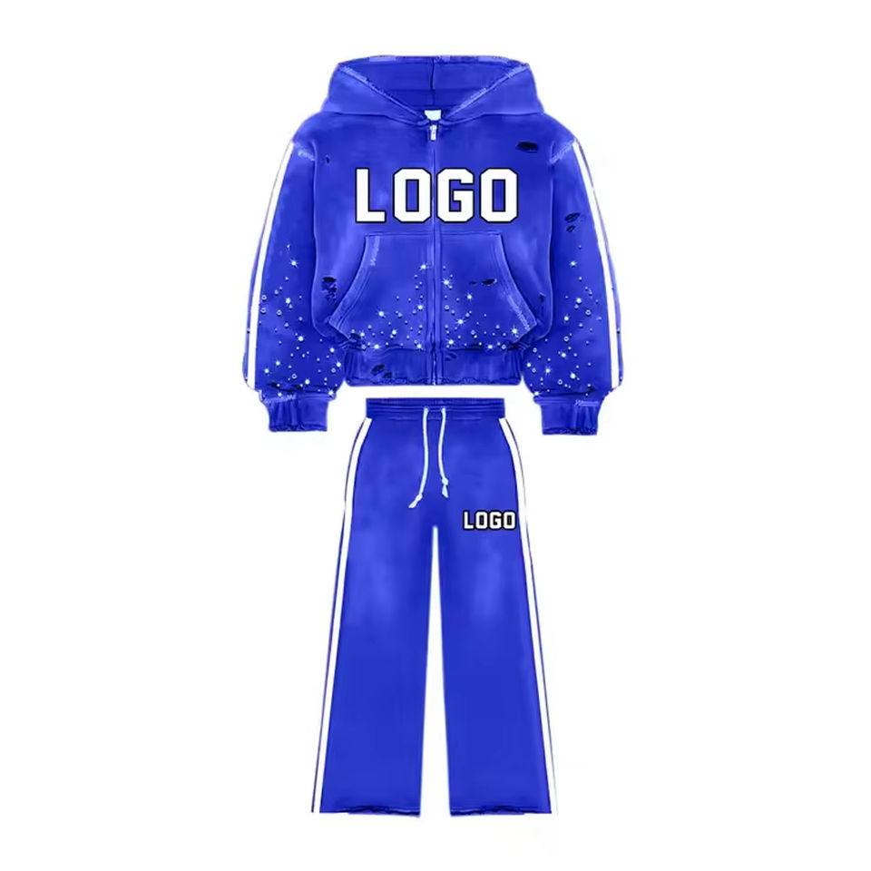 OEM Custom Logo Men's Blank Acid Wash 420gsm Tracksuit Distressed Casual Loose Unisex Jogger Zip up Sun Faded Vintage Sweatsuits