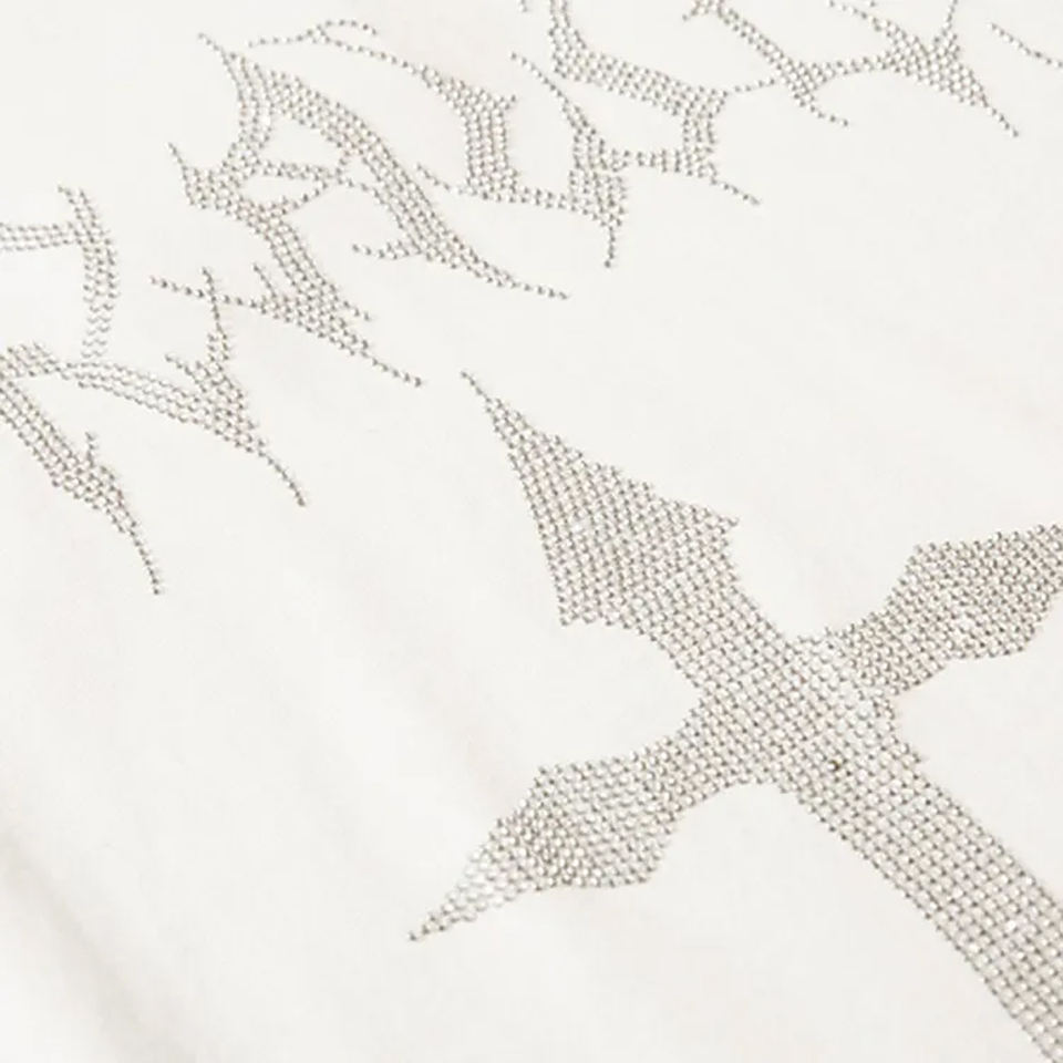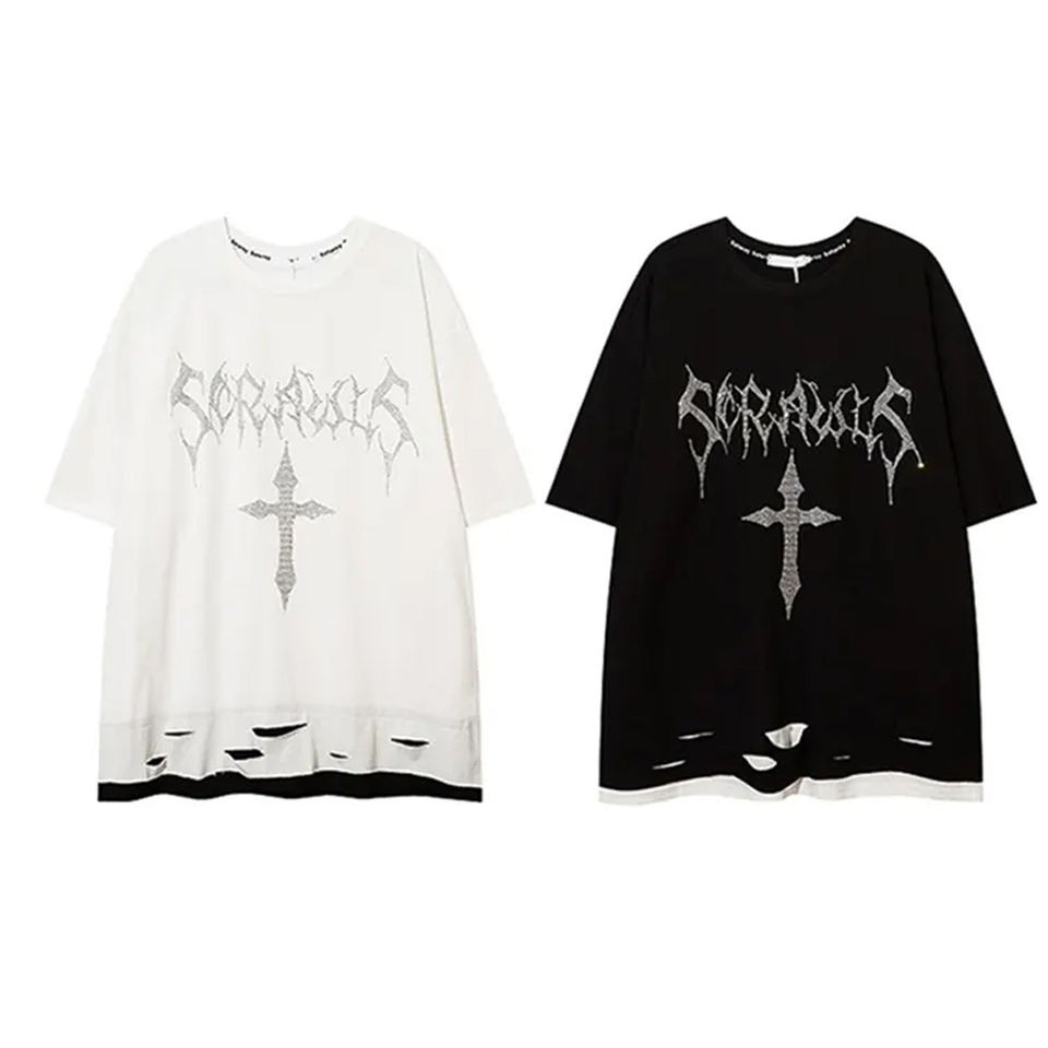 OEM Custom Logo Men's Loose Casual T-Shirt High Street Letter Rhinestone Ironed Drill Oversize Broken Hole Jersey Long Men Shirt