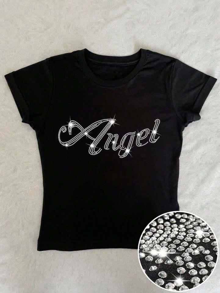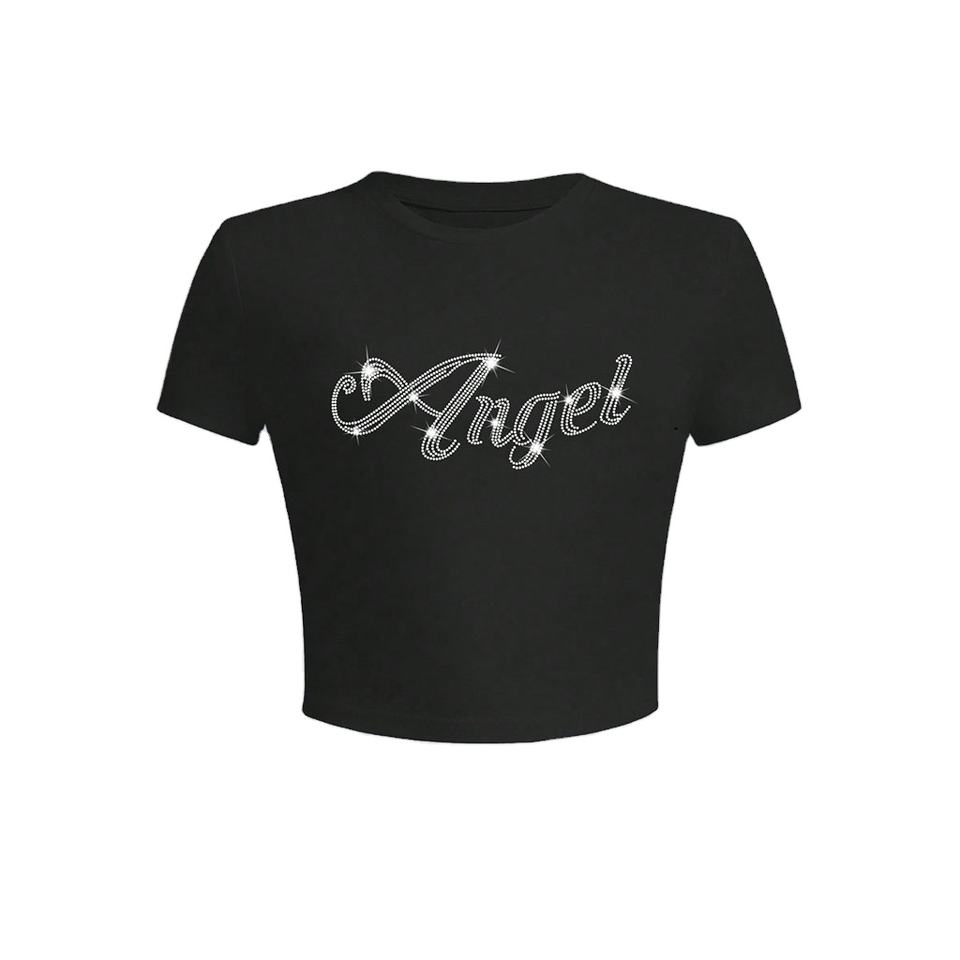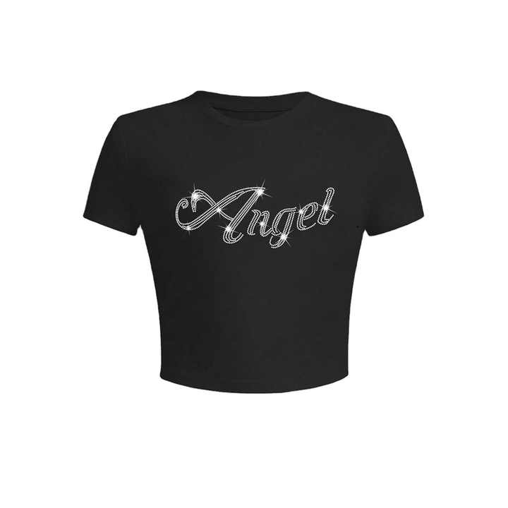 OEM Custom Logo Sparkle Rhinestone Crop T Shirt Women Slim Fit Short Sleeve Fashion Top Cotton Casual Streetwear women's shirt