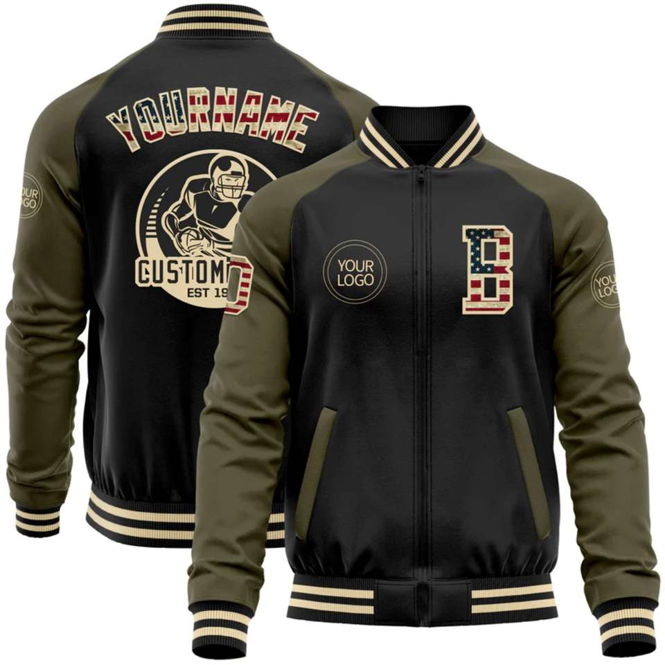 OEM Custom Manufacture High Quality Black Vintage USA Flag Olive-Cream Bomber Varsity Letterman Two Tone Zipper Jacket