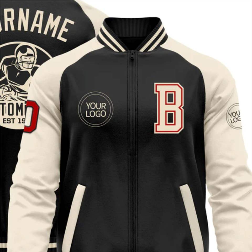 OEM Custom Manufacture Wholesale Black Red Ivory Bomber Varsity Letterman Two Tone Zipper Jacket