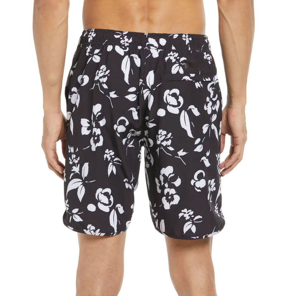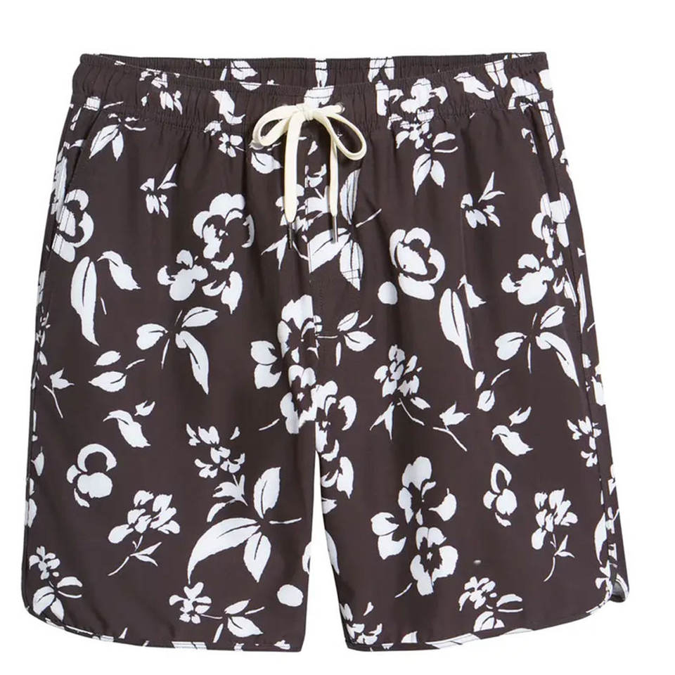 OEM Custom Men Swim Shorts Dark Brown White Floral Print Canvas Beachwear Quick Dry Breathable Eco-Friendly Waterproof UV Shorts