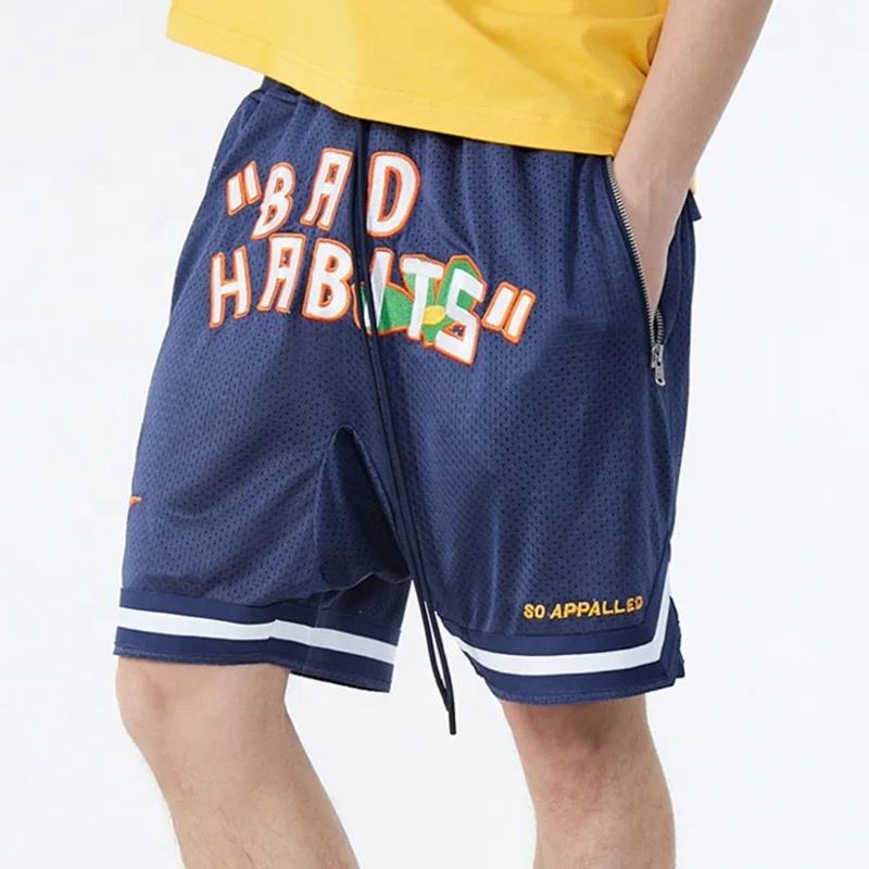 OEM Custom Men's Breathable Cut and Sew Mesh Shorts with High Quality Zipper Pocket Casual Style and Pattern Embroidery