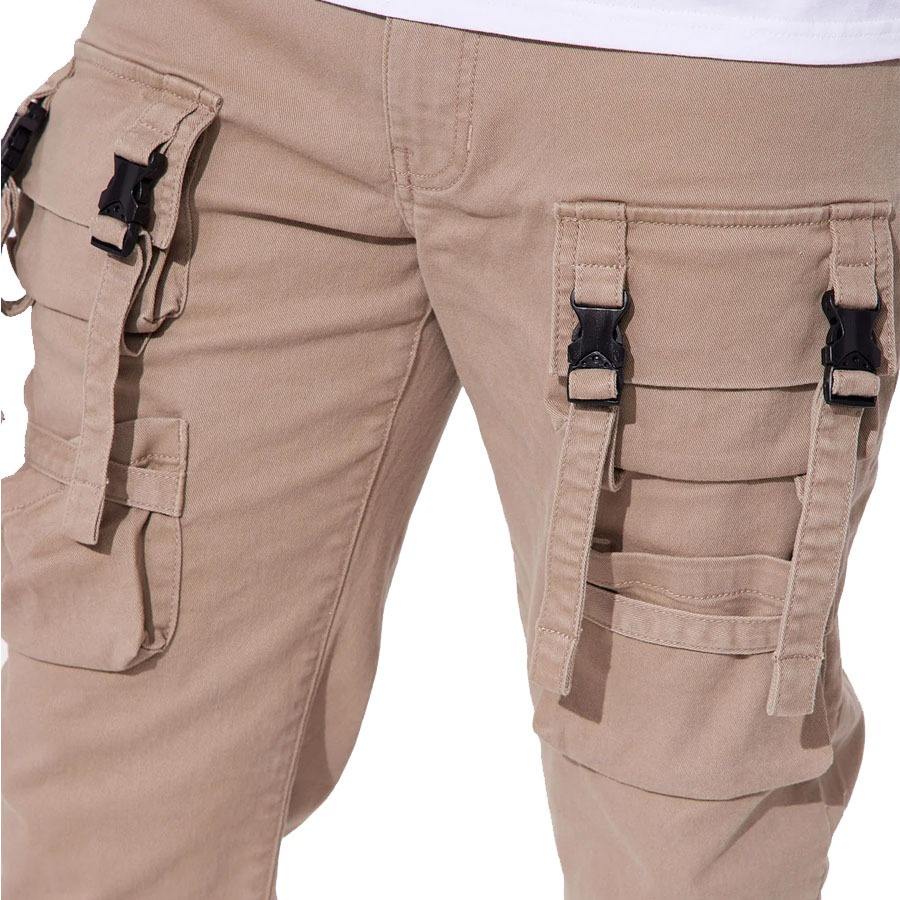 OEM Custom Men's Slim Fit Cargo Pants 100% Cotton Beige Denim Trousers with Buckle Straps and Button Fly Pants & Trousers